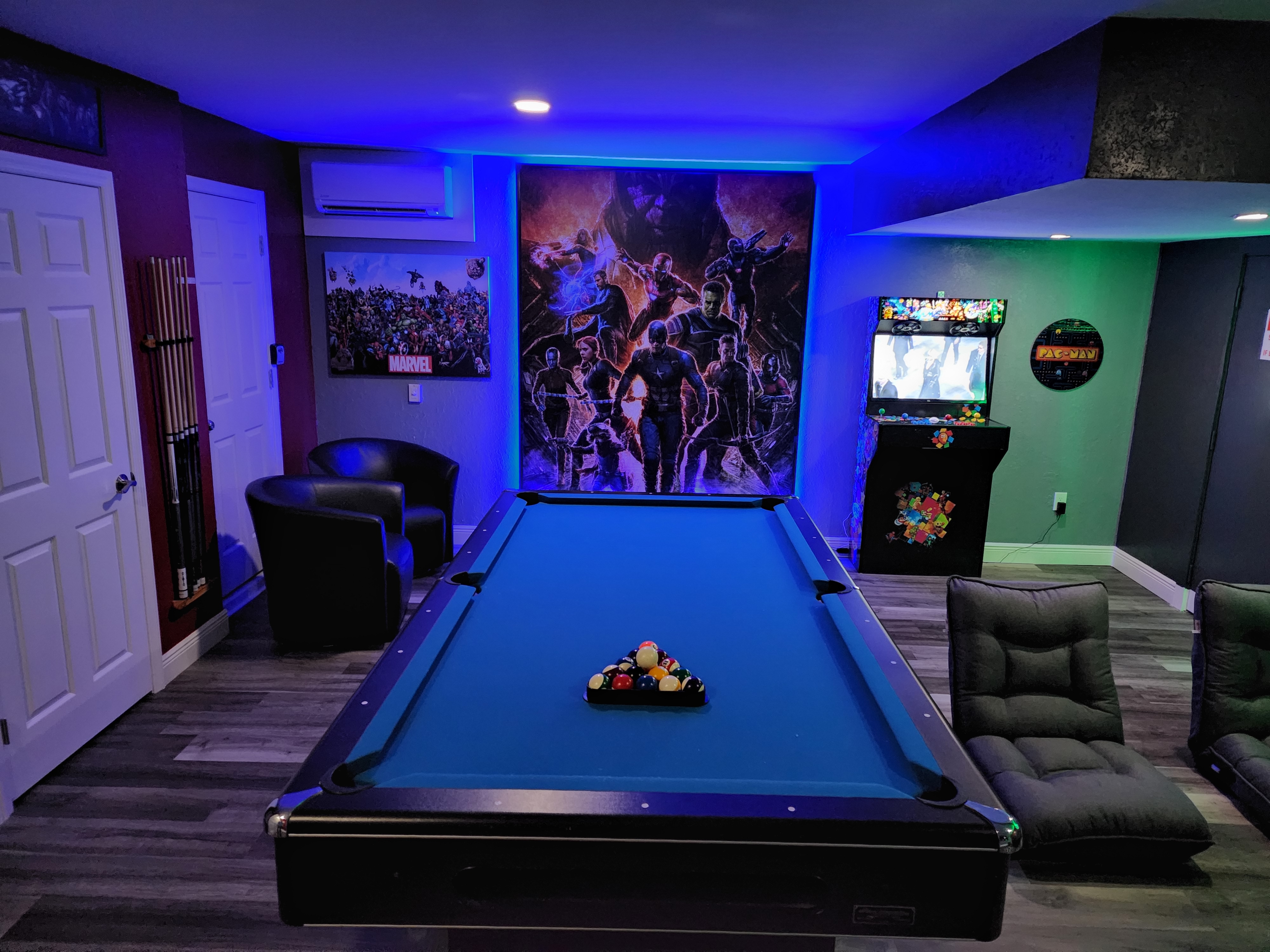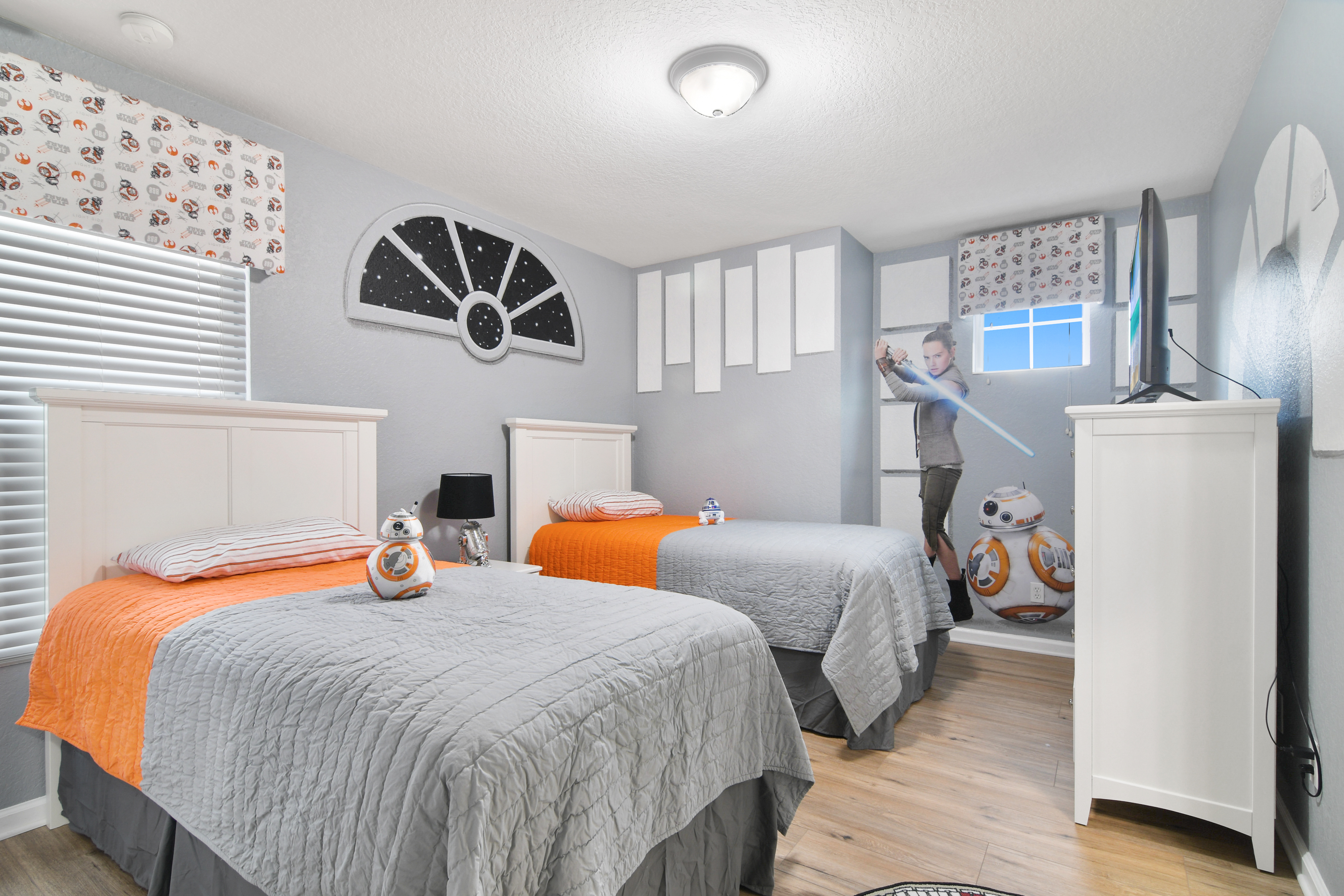 Double Master Bedrooms are conveniently located on the first floor and have easy access to the private lanai with pool and spa. A third Mickey/Princess themed bedroom is located at the front of the home, with two additional Star Wars bedrooms upstairs. Every bedroom in the home features new flooring, an ensuite bathroom and smart TV.